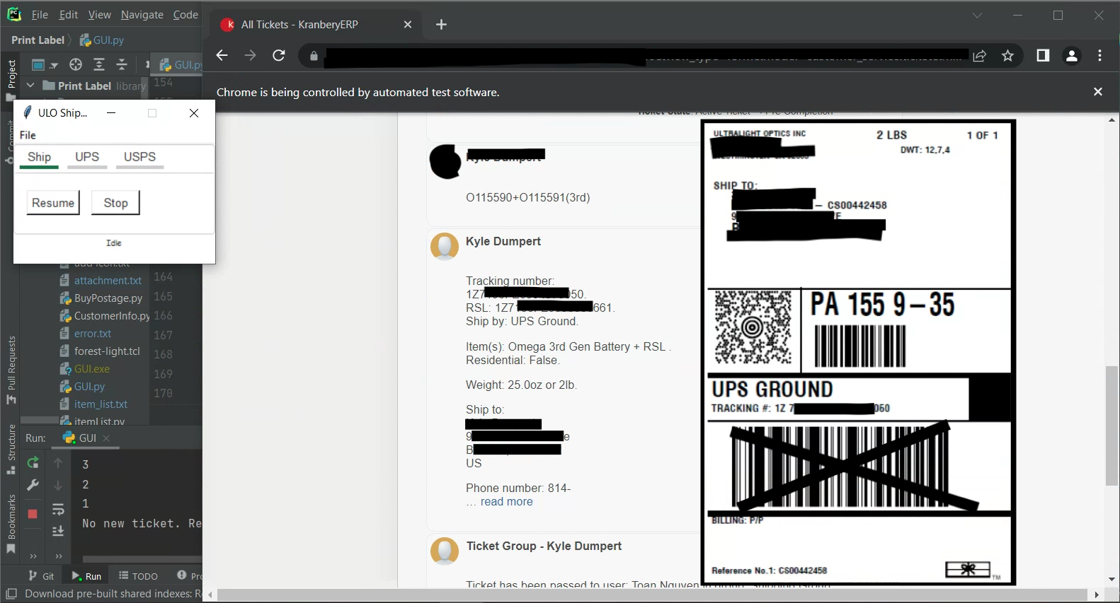 Creates an automated bot that integrates with UPS and Shippo APIs to generate shipping labels from multiple providers, sends shipping notification emails to customers, and forwards tickets to the shipping department for packing items to be sent out to customers.